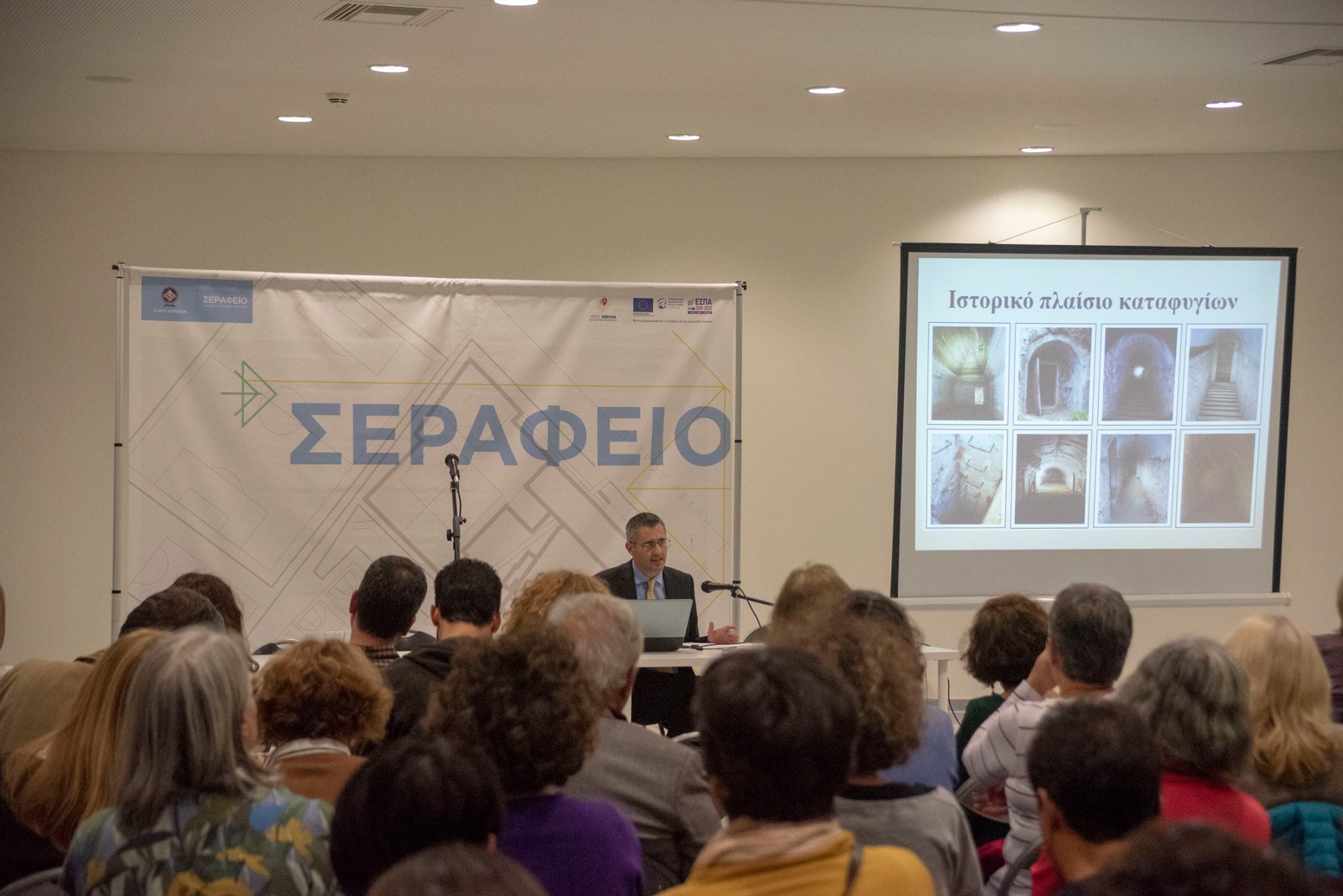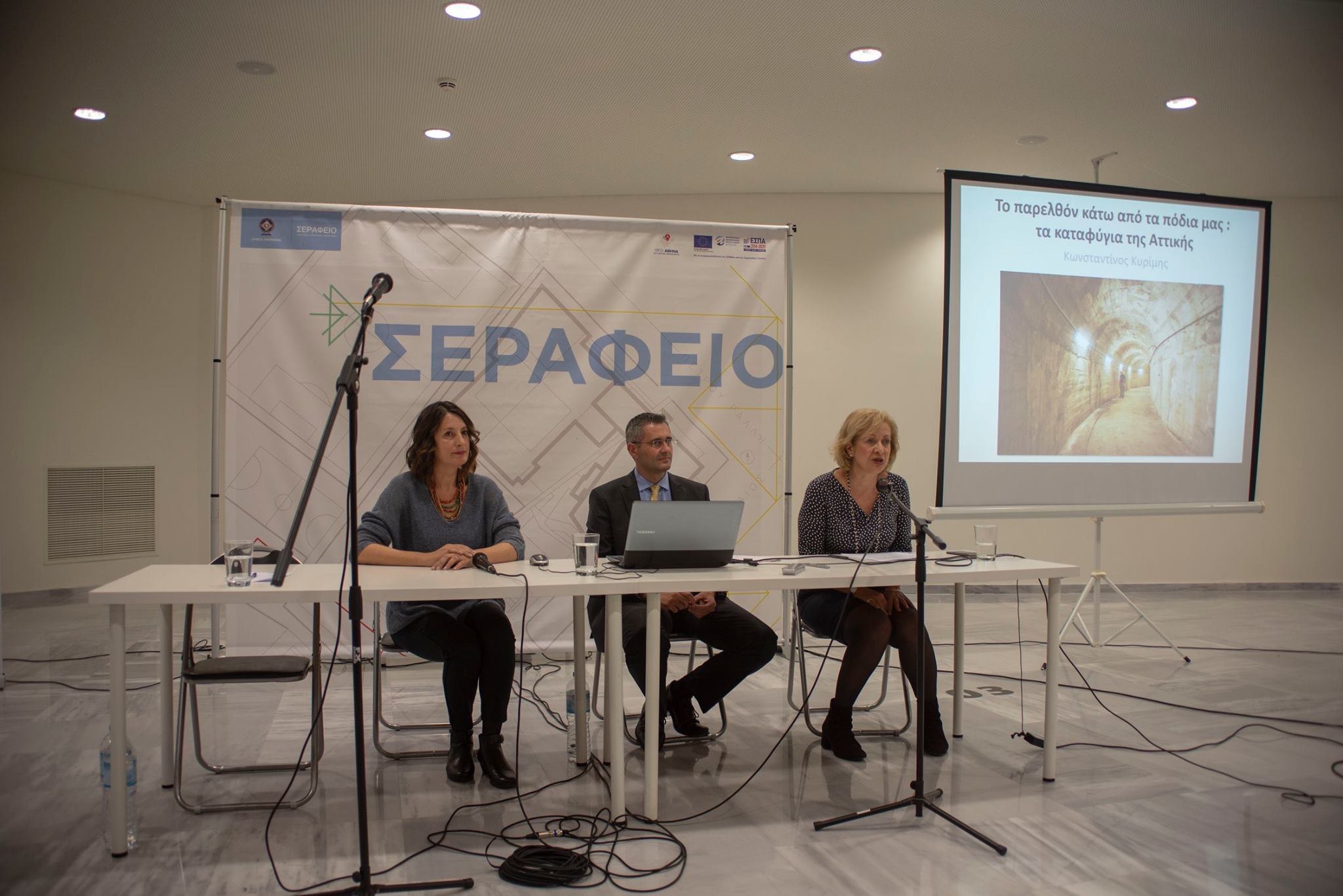 «Θα περιπλανηθούμε νοητά σε σκοτεινές στοές και υπόγειους θαλάμους, στα καταφύγια της Αττικής, αναζητώντας τα ιστορικά ψήγματα και τα μυστικά της πόλης. Θα εξετάσουμε ορισμένα κρυμμένα κτίσματα του παρελθόντος και θα αναφέρουμε ποιο ρόλο έπαιξαν στις απαρχές του β΄ παγκοσμίου πολέμου, στην Κατοχή και την Απελευθέρωση», υποσχέθηκε ο ερευνητής Κωνσταντίνος Κυρίμης στην έναρξη της ομιλίας του «Το παρελθόν κάτω από τα πόδια μας: τα καταφύγια της Αθήνας», στο κατάμεστο Σεράφειο του Δήμου Αθηναίων, στις 29 Οκτωβρίου 2018. Η εκδήλωση πραγματοποιήθηκε στο πλαίσιο του φετινού προγράμματος «12 Οκτωβρίου 1944. Η Αθήνα Ελεύθερη», συνδιοργανωτές του οποίου είναι το Ίδρυμα της Βουλής των Ελλήνων για τον Κοινοβουλευτισμό και τη Δημοκρατία, η Περιφέρεια Αττικής, ο Δήμος Αθηναίων, τα Γενικά Αρχεία του Κράτους και η ΕΡΤ.